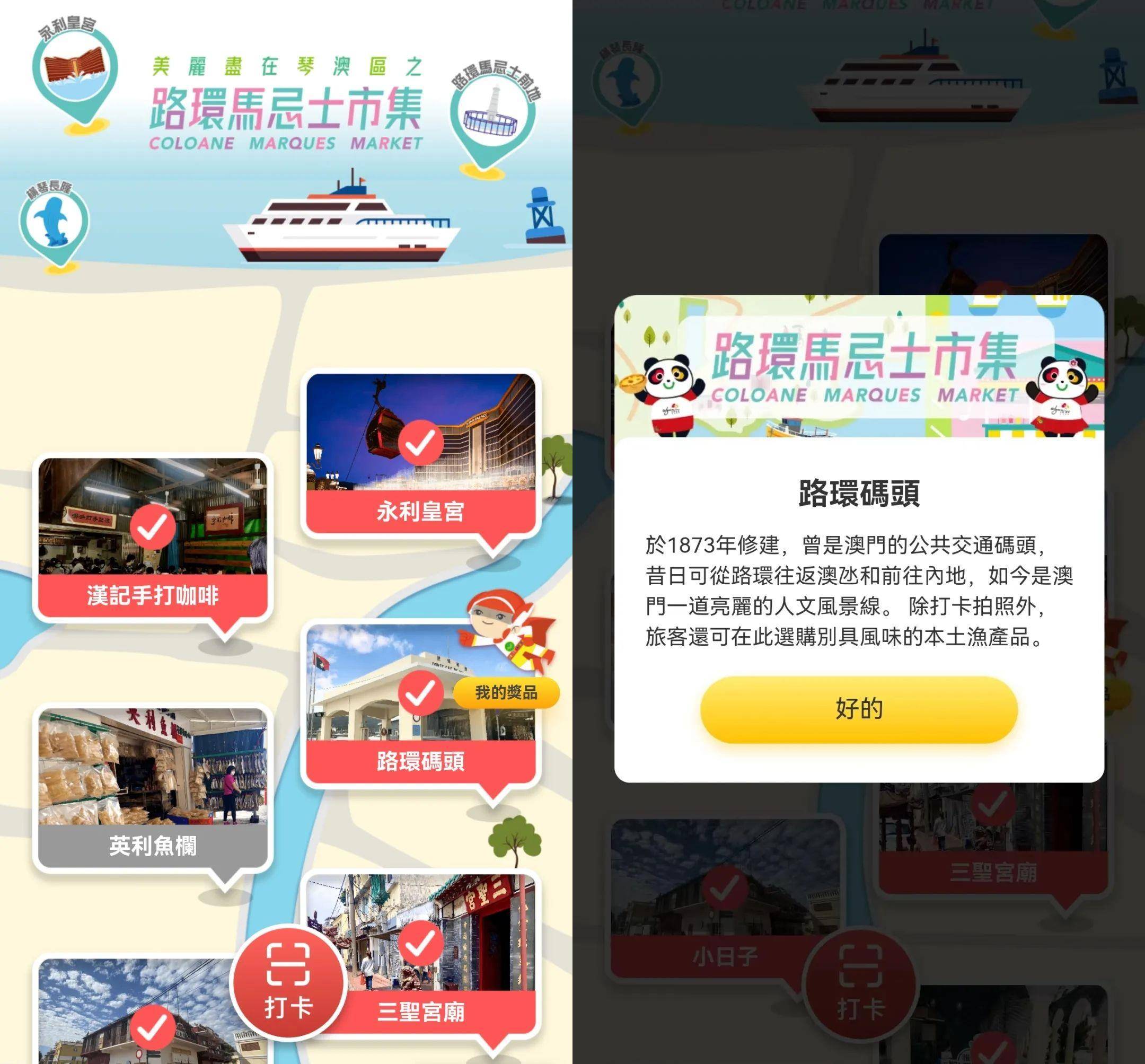 为鼓励用户用脚步丈量城市,深度体验路环旅游目的地,感知路环特色文化,活动定制了一条涵盖文化、美食、购物、度假的旅游线路,共设15个打卡景点。用户跟着地图,到对应的景点扫码打卡,即可点亮地图对应图标,获得现金券及抽奖机会奖励。即使无法亲临线下打卡,也可以通过线上资讯卡片进行云游览,了解目的地背后的文化故事。