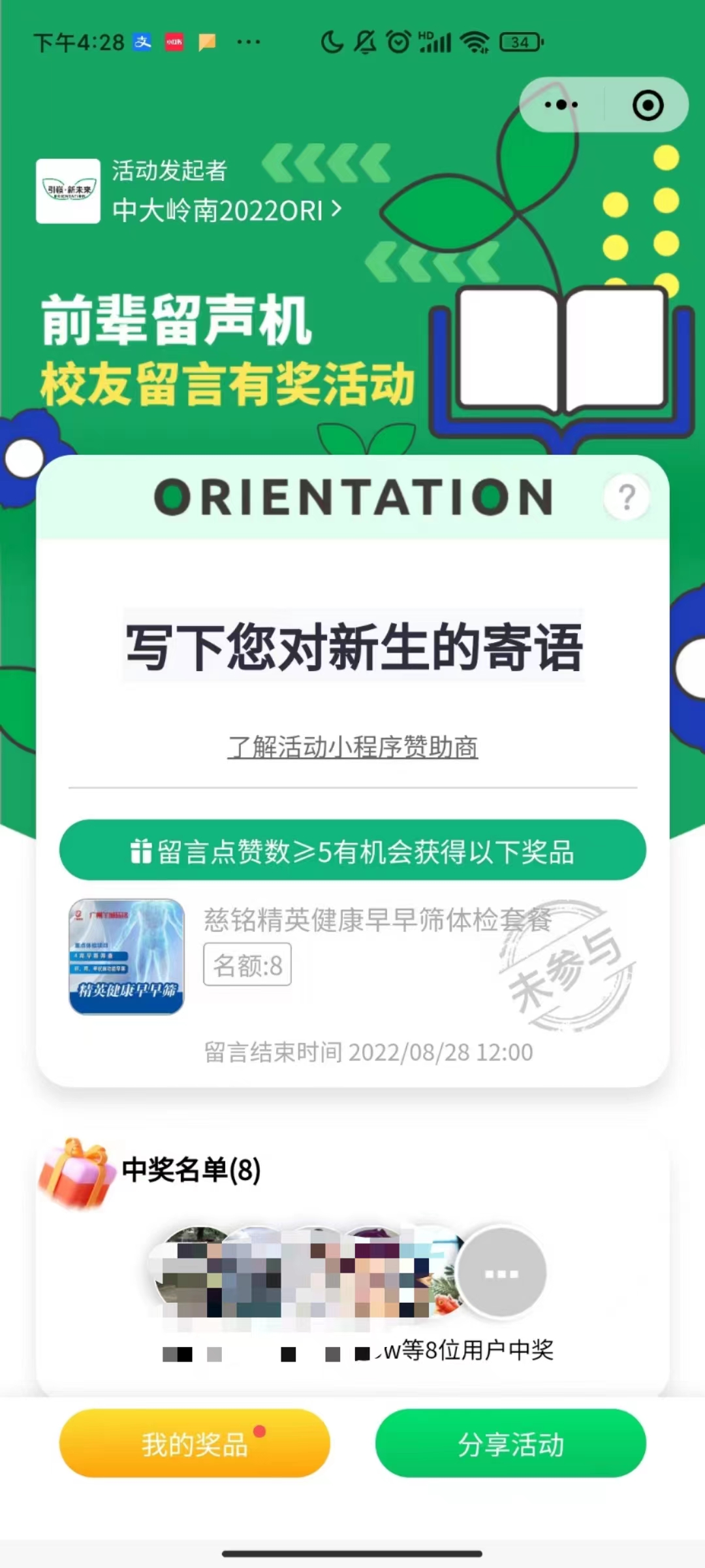达酷互动科技为本次ORI活动定制开发了一款互动小程序,包含活动资讯展示、留言互动、校内打卡、投票、晚宴抽奖等多个功能模块,串联起三天的活动日程,一站式地塑造起活动的线上互动阵地,让每一位同学都能深度参与到活动中。